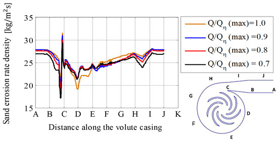 Variation of erosion rate density along the walls of casing with corresponding flow rates.