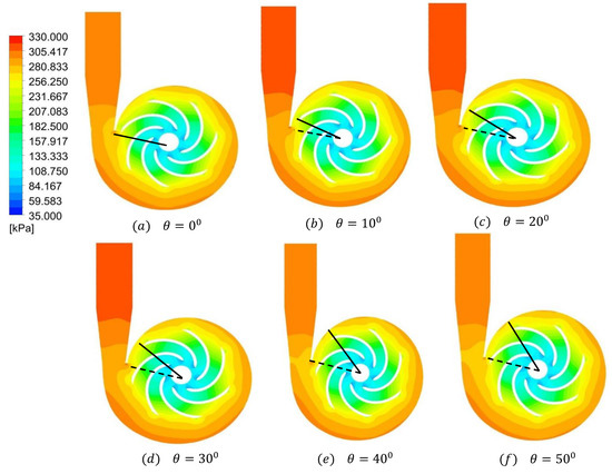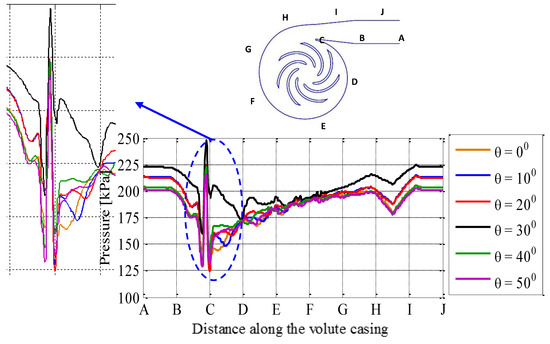 In the current study, result variations for one pitch are reported. Figure 14 shows pressure contours on the turbo surface extracted at 50% of the blade span corresponding to different phases, i.e., 0° − 50°. When the blade trailing edge is coincident with the line joining the throat of the casing to the axis of rotation, the blade phase angle is taken as as shown in Figure 14a. It can be seen that for phase angle , maximum pressure at the casing exists then increases at some other locations, and it starts decreasing as the phase angle further increases from. On the other hand, the variation of pressure along the casing is shown in Figure 15. Pressure increases clearly and significantly everywhere in the casing as the phase angle increases from and then it decreases from. The pressure curve in Figure 15 from point C to D shows a quite different distribution compared to all other curves plotted for various phase angles. A maximum difference of pressure was observed as 49.91%, just ahead of point C, between the forces recorded at a phase angle of and. This difference was recorded at 9.46% at the exit of the pump casing, reflecting that a fluctuating pressure will be recorded at the exit of the pump with a fluctuating frequency equal to the number of the pump’s impeller blades. The magnitude of flection for the current design was observed as 9.46%. Its dependence on other parameters, however, requires further investigations.