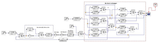 Figure 8. Scheme for studying the temporal characteristics of the automatic control system model for the heat carrier temperature of the heat exchanger of a heat supply system with acoustic–magnetic devices in the simulation environment Scilab 6.1.