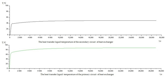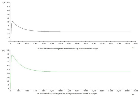 Figure 10. Transient characteristics of the model of the automatic control system of the temperature of heat carrier when the temperature of the water in the primary circuit changes (for a heat supply system with acoustic–magnetic devices).