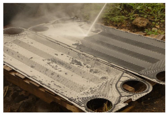 Figure 13. The cleaning process of heat exchanger plates (of a heat supply system with acoustic–magnetic devices).