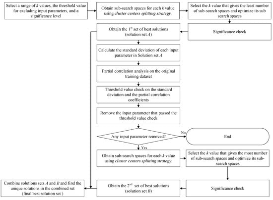 - Select the k value that provides the least number of sub-search spaces and perform the initial optimization of its sub-search spaces to obtain multiple optimal input parameter combinations. Use a significance check to extract “best solutions” from the optimal solutions. These “best solutions” will be called solution set A.
