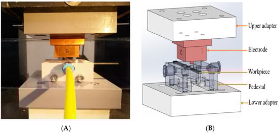 The structure of the electrode module: (A) actual device used during experimentation and (B) 3D design of the electrode module.