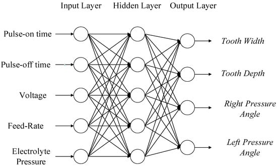NNs are a commonly used technique for input-output mapping in many fields due to their ability to approximate functions to the desired degree of accuracy, and unlike physics-based models, the shape of the approximation function does not need to be assumed before training. Due to the lack of physics-based models, NN was used to model the relationship between the input parameters and performance indicators of the ECM. NN, as shown in Figure 4, consists of input, hidden, and output layers with weighted connections connecting the input layer to the hidden layer and the hidden layer to the output. Gradient descent (GD) and Levenberg–Marquardt (LM) are commonly used to train the weight values of the NN but as they are gradient based algorithms, their convergence to the global minimum is very sensitive to the starting points; therefore, a hybrid GA-LM algorithm was used to train the NN. GA is metaheuristic algorithm that can search the solution space more thoroughly, therefore, it was initially used to set the weights of the NN. The training of these weights was then continued with LM to leverage its rapid local convergence capabilities.