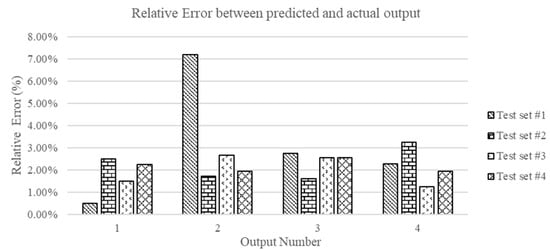 As stated earlier, the available experimental data was divided into training, validation, and testing sets. Out of the 32 data sets available, 24 data sets were used in the training set, 4 in the validation set, and 4 in the testing set; assignments were made by random selections. During the training procedure, GA had a population size of 50, a crossover fraction of 0.8, and it was run for 500 generations. Once the training was completed using GA, the weights were then trained using the LM algorithm, which had an iteration limit of 1000. A trial-and-error method was used to determine the best NN structure, which had 5 input neurons, 1 hidden layer with 4 neurons, and an output layer with 4 neurons. To validate the trained NN, it was used to predict the outputs of the 4 different test sets and the relative error between the predicted and the actual outputs was calculated as shown in Figure 5. Table 1 shows the mean absolute percentage error for each output of all of the test sets.