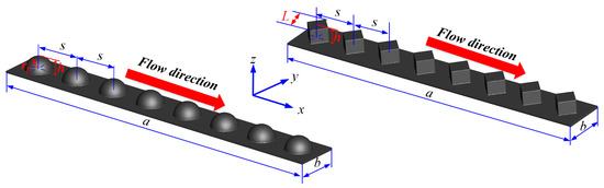 The thermal performance of the channel with dimples are studied in the present study. Figure 1 shows the geometrical structure of the dimpled channel. The model for this study is a rhombus channel with an array of dimples. The length (a) and width (b) of rectangular channel are 120 mm and 20 mm, respectively. The radius (rp) of hemispherical dimple is 3 mm and the width (L) of rhombus dimple is 3 mm. The radius–depth ratios (rp/h) of hemispherical dimples are defined as rp/h = 0.1, 0.2, 0.3, 0.4. Similarly, the length–depth ratios (L/h) of triangle dimples are adopted for this study as L/h = 0.1, 0.2, 0.3, 0.4. The distance (s) between each other dimples is 8 mm.