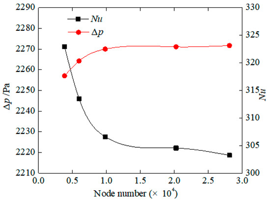 Figure 5 shows the effects of mesh sizes on the distribution of the Nusselt number and pressure difference through a dimpled channel. We conduct to the mesh independency test for hemispherical dimpled channel at Re = 12,000, and analyze the effect of five different grid densities of the channel on Nusselt value and pressure difference. The five configurations have grid layout with approximately 4682, 5325, 9634, 20,488, and 28,320 cells, respectively. When the grid number increases from 9634 to 28,320, the Nusselt number decreases from 322.4 to 323.13, and the pressure difference increases from 2227.6 Pa to 2218.6 Pa. It is clearly visible that after 20,488 further increasing the grid number causes negligible variations in local Nusselt number and pressure difference values on the dimpled channel region.