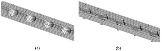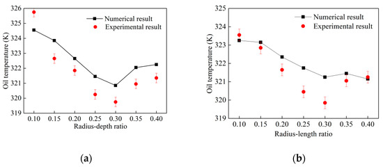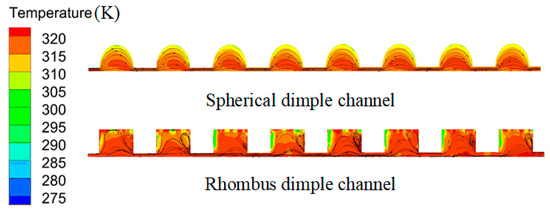 For the validation of the proposed model, the results for dimpled channel were determined using the proposed model and compared with the current experimental results. Figure 7 presents the comparison of the oil temperature along the x-direction in the dimpled channel obtained by the proposed model with the results determined experimentally. In Figure 7a, the trend of the numerical result for channel with hemispherical dimple is seen to be in line with the outcomes of the experimental test. The maximum and minimum absolute deviations of the numerical results from the experimental ones are 0.37% and 0.27%, respectively. In Figure 7a, for channel with rhombus dimple, the maximum and minimum absolute deviations between the numerical results and the experimental results are 0.43% and 0.03%, respectively. Thus, a good agreement has been achieved between the numerical simulation and the experimental data and the proposed numerical model can be used to predict the experimental results with reasonable accuracy and can therefore be used to analyze the other cases.