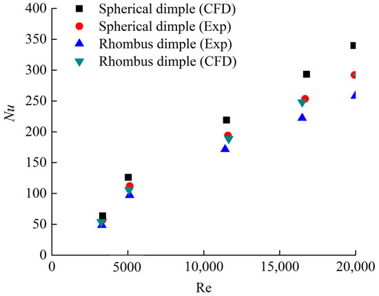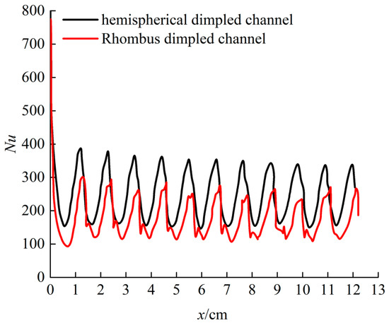To analyze the fluid flow and heat transfer characteristics in hemispherical and rhombus dimples channels, it is necessary to compare the calculation results with the result of reference [34]. Figure 10 shows the effect of Reynolds numbers on the Nusselt number of the dimpled channel with different dimple shapes. As Reynolds number increase, the Nusselt number of all channels increases. The Nusselt number of hemispherical dimple channel varies from 50 to 278, which is 1.16 times than that of a rhombus dimpled channel. Comparing to the hemispherical dimple channel, the Nusselt number of rhombus dimple channel decreased by 14.4%. Therefore, the channel with hemispherical dimples shows the highest Nusselt numbers among the two studied dimple shapes.