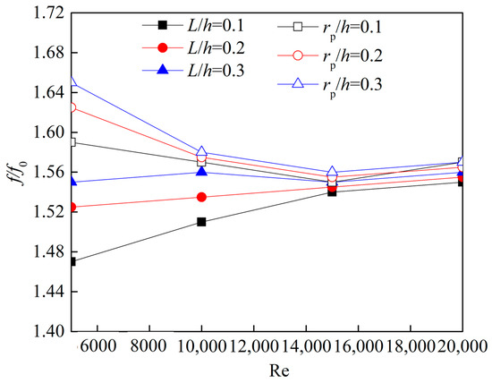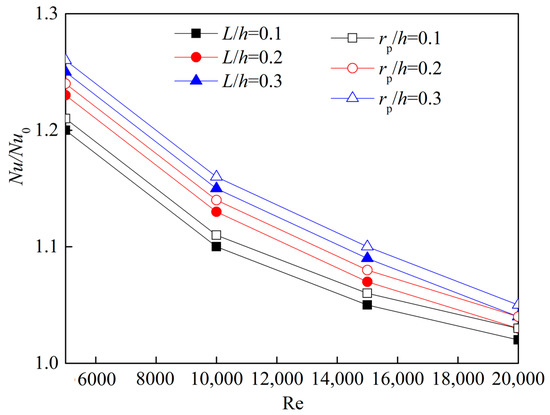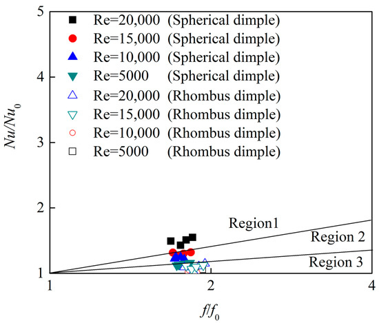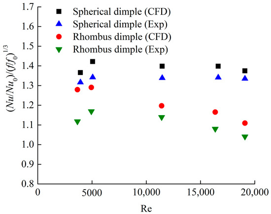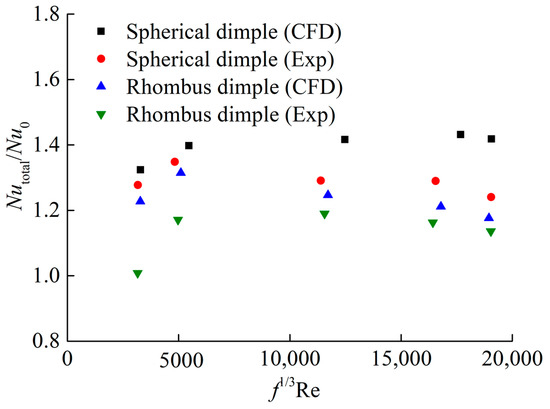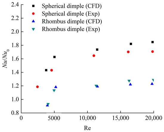 Figure 11 presents the effect of Reynolds numbers on the Nusselt number enhancement of the dimpled channel with different dimple shapes. The Nusselt number enhancement of the hemispherical dimple channel is about 1.2–1.62, which agrees well with the experimental data. The Nusselt number enhancement of the rhombus dimple channel is about 0.9–1.17, which is similar to the experimental values of the dimpled channel flow. For two kinds of dimpled channels, when the Reynolds number is more than 11,598, the heat transfer enhancement of dimpled channels seem to be independent of the Reynolds number. In the case of low Reynolds number at 5028, all the dimpled channels show significantly lower heat transfer enhancement, which is mainly due to the lower level of turbulent mixing induced by the dimples. When the Reynolds number is set to 5028, the heat transfer enhancement performance of rhombus dimple is 20.9% lower than that of hemispherical dimple, and such a rhombus dimple structure should be avoided for low Reynolds numbers.