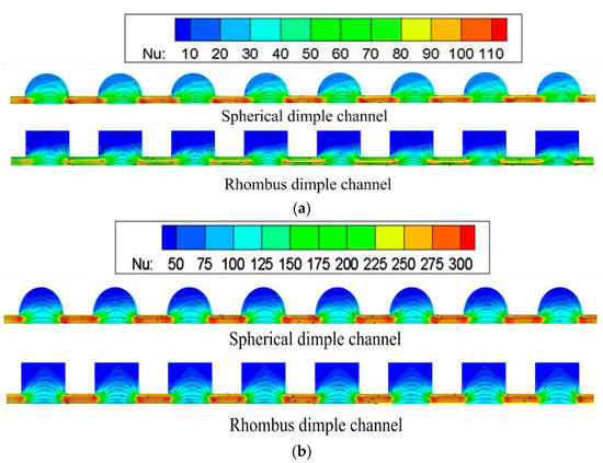 Figure 12 shows the local Nusselt number distribution on the surface of dimpled channel under different Reynolds number. In this cases, the Reynolds numbers are chosen to 3000 and 20,000. The local Nusselt number can be defined as the local heat flow, the local temperature of the end wall and the local volume average temperature formed by the fluid flow. This result is consistent with the Nusselt number calculation based on the mean temperature difference, as shown in Equation (14) [35]. Due to the flow separation, all the dimples show a low heat transfer rate in the upstream half of the dimpled wall. As shown in Figure 12a, the convective heat transfer is distinctively enhanced in the front and back edge of the dimpled wall. The channel with hemispherical dimples shows the higher local heat transfer enhancement than that of the channel with rhombus dimples. This is because the straight slope of the upstream dimpled wall can effectively reduce the low heat transfer area. A more steeply curved wall in the upstream half of the hemispherical dimples could change the vortex structure to asymmetrical distribution in the dimples, which is consistent with the findings from Turnow et al. [16]. In Figure 12b, with the Reynolds numbers increase, the low heat transfer area in both dimple channels become smaller. This result could be because the heat transfer enhancement of the dimpled channel is significantly lower at a lower Reynolds number of 3000. Due to the effect of heat flow in inlet and outlet ports, there is high heat transfer performance of fluid flow at the leading edge of the concave channel, and then it drops rapidly.