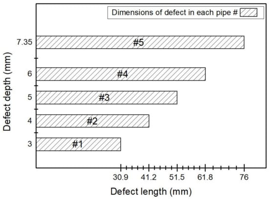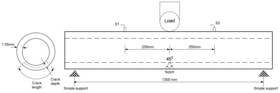 A universal testing machine was used to perform three-point bending (destructive testing) on predefined locations of five identical steel pipes 1900 mm in length and 7.35 mm in thickness. A couple of AE Machines were mounted on each pipe, where each sensor was axially located 250 mm either side from the mid-span and circumferentially opposite to a machined notch, as shown in Figure 1 and Figure 2. Five different notch sizes (one notch for a single pipe) of varying depth and constant length to depth ratio (10.3) were used as shown in Figure 3.