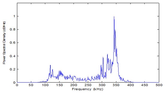 The AE signal from the three bending point tests have been recorded at 90 s total time of 1450 batches of 4 ms at a 5 MHz sampling rate. A typical raw AE batch was captured as in Figure 5, while Figure 6 showed a normalised frequency domain plot for the same batch. Unlike the indentation tests, where currently the energy was mostly in a high frequency band at around 350 kHz, some peaks were still visible at a frequency band of 100–150 kHz.