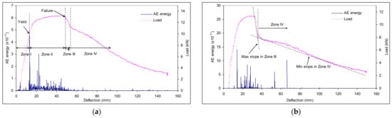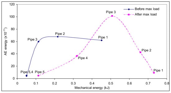 The AE energy is calculated by adding the energy batches for each of the relevant files (defect). The mechanical energy is estimated by calculating the area under the curve of force deflection. The AE and mechanical energies for the entire experiment are shown in Figure 8 and Figure 9 and then split between that up to maximum load (Zones I and II) and that after maximum load (Zones III and IV). It is found that the AE energy for pipe 3 is at a maximum with regards to the total mechanical energy input and that this is associated with the period after maximum load. Zones I and II show an increase in the defect size.
