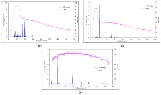 The mechanical load and AE batch energy versus deflection; (a) pipe 1; (b) pipe 2; (c) pipe 3; (d) pipe 4; and (e) pipe 5.