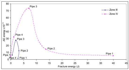 Interesting observations can be noticed from the AE energy plotted against two components of fracture energy. Zone III fracture energy was a particularly small proportion of the total mechanical energy. Subsequently, this approach proved that there was a change in the AE energy trends between pipe 1 and pipe 5 that also occurred at pipe 3. The test was conducted for A plane-stress/plane-strain by comparing the product of the yield stress, σy, (240 MPa) with the apparent value of KI and the length of the crack front, L: