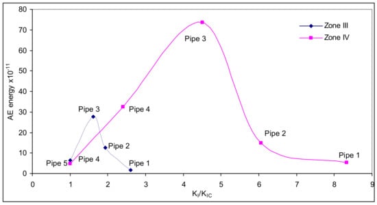 True measures of KIc can be determined for pipe 4 (pop-through) and pipe 5 (circumferential tearing) when < 1 and taking values of KI at the failure. Consequently, the degree of plasticity of the fracture can be measured by KI/KIC, which showed interesting findings as shown in Figure 13 when it was plotted against AE energy.
