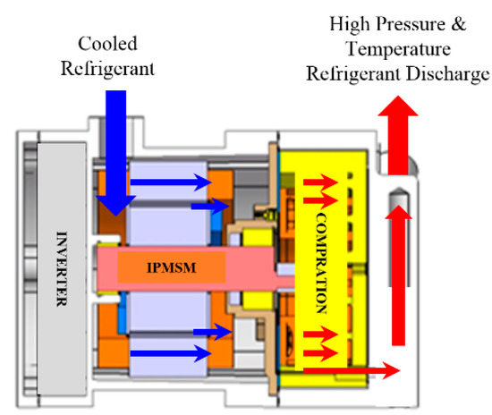 As shown in Figure 1, the IPMSM for driving an electric refrigerant compressor can perform cooling through the cold refrigerant directly through the motor; however, it is a typical high saturation magnetic flux density electric machine. This is because the inner permanent magnet rotor structure is applied to ensure high reliability, and a concentrated winding stator with low flow resistance and low power loss is used to achieve high volumetric efficiency in the compression part. Therefore, the proposed three iron loss analysis methods and three different rotor structures were compared with each other to compare the new iron loss analysis characteristics, and the rotor type with the lowest loss in the same concentrated winding stator structure can be determined.
