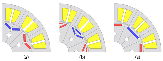 (a) Single layer V-shape magnet rotor. (b) Dual layer delta-shape magnet rotor. (c) Single layer flat-shape magnet rotor.