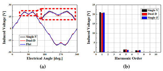 The detailed specifications of the concentrated winding-type IPMSMs for driving the A/C refrigerant compressor are as follows: number of slots in the stator, 12 slots; magnetic wire specification, 28 turns; stator core shape outside diameter, 96 mm; length, 37 mm. The three magnet shapes for comparison were single-V, single-flat (F), and dual-delta (D) magnets. The magnet area for every pole (30.73 mm2) was identical. The main operation points were 6540, 4905, 3270, and 1635 rpm with a 24 A phase current, and the expected torque was approximately 7.0. Figure 2 presents the structure of the concentrated windings of the IPMSMs with three types of rotor structures. Figure 3a illustrates a comparison of the induced voltages of the three different rotor shapes with identical concentrated winding stators without an input current at 1000 rpm. Figure 3b shows a fast Fourier transform (FFT) comparison of the frequency domain. The differential of the back electro-motive forces of the three magnet rotor shapes was lower than 0.25%. This is similar to the FFT results.