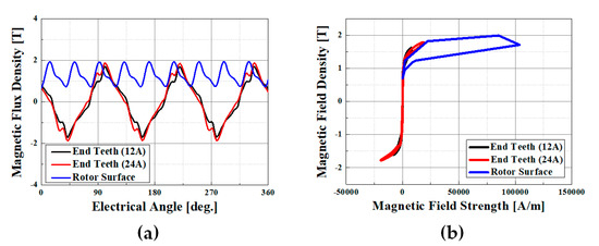 Figure 6a shows the flux density at different (12 A and 24 A) input currents of the stator end-teeth and the rotor surface in the time frame. Figure 6b shows the B–H loop at that time. Although the alternating flux density on the surface of the rotor was smaller than that of the stators, the B–H loop was much larger than the stator. This DC bias and large loops are characteristic of the IPMSM rotor structure; hence, they should be considered [10,11].