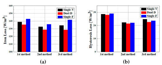Figure 9a,b show a comparison of the total iron losses for the three hysteresis losses and two different eddy current loss calculation methods at a four-step operating speed. Each point considers the same maximum torque per ampere point at 24 A. The results reveal that the iron loss of single-F in the entire operation range is high, and the total iron loss calculated based on single-F and -V were 2.5–3.4% and 5.2–5.1% higher than that of dual-D, respectively.