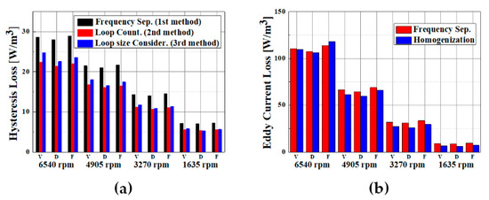 Figure 9b shows a comparison of the eddy current losses at 6540 to 1635 rpm in the operating range. The loss obtained using the frequency separation method was higher than that using the homogenized eddy current loss calculation method. This is due to the iron loss data in Figure 7a, this is proportional to the square of the input frequency and, this because data had been used the frequency separation method for eddy current loss calculation. At the same time Figure 9b also shows the calculations result of the homogenization method. In this case, the eddy current loss data from the AC magnetic field in-put conditions in Figure 7b is used.
