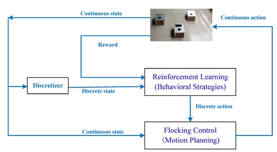 In this paper, flocking control is adopted to ensure that all robots avoid collisions and move together towards a target. Reinforcement learning is used to enhance the robots’ ability to analyze, predict, and select appropriate actions to perform flocking motion. The proposed system combines reinforcement learning in discrete space and flocking control in continuous spaces. This generates an effective combination of high-level behaviors (discrete state and action) and low-level behaviors (continuous state and behavior). As shown in Figure 1, the control system structure includes two main parts: (i) the reinforcement learning module for behavioral strategies; and (ii) the flocking control module for motion planning.