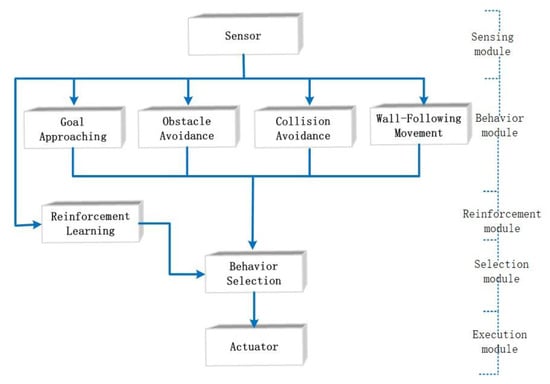 The system combines behavior-based robot technology and flocking control, to facilitate the mobile robots with an overall behavior to achieve the target. It is important to select the appropriate behavior in light of the environment, and therefore, there is a need to use adaptive machine learning algorithms to make the decisions. Therefore, as shown in Figure 2, the system control structure includes the sensing module, the behavior module, the reinforcement module, the selection module and the execution module.