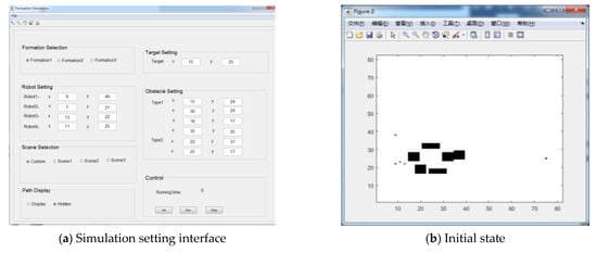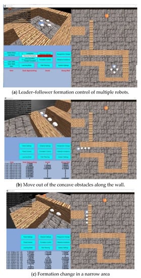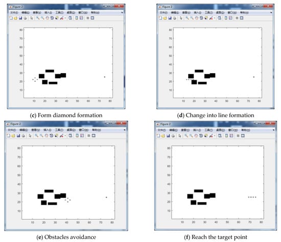 Figure 14 shows that the mobile robots formed a triangular formation and moved toward the target. When the robots encountered a narrow obstacle channel, they changed their formation into a line formation in order to pass through the obstacle. The proposed control algorithm exhibited good control effects.