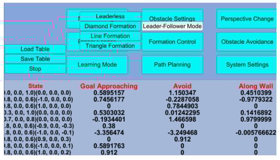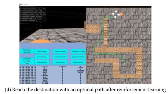 A display interface is designed on the visualization platform for behavior-based robots as shown Figure 12. The “Learning Mode” button can show the potential field forces, e.g., state, goal avoidance force, obstacle avoidance force, and along the wall force, of the robot in the training phase. The robot can first explore the unknown environment and save the data in the Q table of reinforcement learning. If robots move in the same environment in the future, they can directly avoid obstacles and approach the target very quickly because they have acquired and learned the best motion planning decision. When encountering a concave obstacle, the behavior along the wall can be recorded by reinforcement learning, avoiding the repeating exploration path, and calculating the control force.