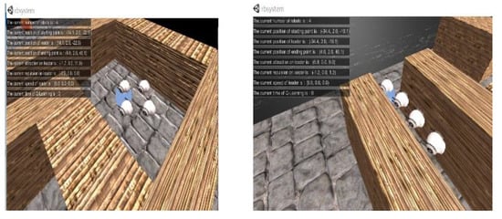 (3) The proposed algorithm is simulated and experimented, taking several aspects into consideration. Obstacle-avoidance and formation control effects of the flocking control optimization algorithm proposed in the paper are preliminarily tested in the MATLAB simulation environment. A visual simulation platform has been developed to test the proposed algorithm, which can not only observe the movement of the robots, but also observe the motion planning strategy based on the reinforcement learning and the output value of control quantity of each behavior based on flocking control in real time. The data visualization of process control can thus be realized. Eventually, the proposed algorithm has been transplanted to robot operating system (ROS)-based wheeled robotic vehicles for further experiments.
