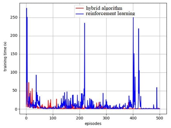 In order to compare the performance of the traditional reinforcement learning and the hybrid algorithm, we designed a complex obstacle environment on the simulation platform and added moving obstacles. The convergence simulation of the training process of the two algorithms is shown in Figure 11.