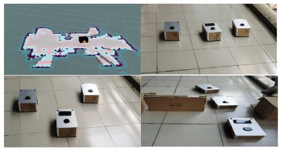 In the experiments, the robot followed the stabilized formation. The effective communication range was estimated to be 500 m. The mobile robot HITM as composed of many modules, such as an on-board upper computer, laser radar, and RF modules. The upper computer as the ROS host conducted information interactions with the ROS slave on the client PC by routing and networking through wireless Wi-Fi signals. The main control panel could also interact with the client embedded development board by using the RF module in the form of 2.4G wireless communication.