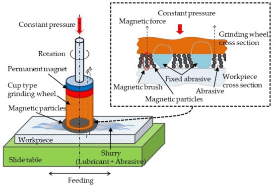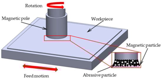 Magnetic abrasive finishing (MAF) process are used for the precision finishing of the inner surface of circular tubes, the mirror finishing of flat parts, and the precision edge finishing of complex curved parts [1,2,3]. Among them, when using the plane MAF process, a certain gap is provided between the magnetic pole and the workpiece, and a magnetic brush composed of fine particles (mixed magnetic particles and abrasive particles) is formed in this gap. Although this process can obtain a better surface finish, there is a problem in material removal efficiency, and there is a strong demand for improving the finishing efficiency. Shinmura et al. [4,5] proposed and designed a plane MAF device, which generates a magnetic field from an electromagnet. The process principle of plane MAF is analyzed, and the influence of the supply weight of finishing fluid and magnetic abrasive on the grinding depth and surface roughness is discussed. In references [6,7], they also discussed the finishing of the outer surface of the cylinder and the inner surface of the tube through the MAF process, and investigated the influence of some process parameters on the finishing characteristics. Zou et al. [8,9,10] proposed the MAF process using an alternating magnetic field. They investigated the process mechanism and finishing characteristics, and concluded that the MAF process using an alternating magnetic field can achieve higher finishing efficiency and surface quality compared with the case of a static magnetic field. Wang et al. [11] discussed the use of MAF process for finishing pipes of three materials, such as Ly12 aluminum alloy, 316L stainless steel and H62 brass. They reported that using transformer oil or stearic acid liquid can significantly improve material removal rate (MRR), because transformer oil helps to form a physisorption film, and stearic acid helps to form a chemisorption film. Jiao et al. [12] applied the MAF process to improve the surface quality of the hole wall and eliminate burrs on the edge of the hole. They used 7075 aluminum alloy as a workpiece, and analyzed the influence of magnet spinning speed, abrasive mesh, and abrasive filling amount on the diameter deviation of the hole and surface roughness of the inner wall. They reported that the burrs were significantly removed and the burr removal efficiency was improved by 33.3% compared with the conventional magnetic abrasive finishing process. Vahdati et al. [13] applied the MAF process to finishing aluminum pipes. They discussed the influence of the magnetic flux density, machining time, the amount of magnetic abrasive powder and the rotation speed of the workpiece on the surface roughness. According to the experimental results, using permanent magnets of 1 T, the amount of 8 g of ilmenite powder of mesh 150, rotating speed of 750 rpm, and 30–40 min of process time, will result into a surface roughness of 0.45 μm Ra from the original value of 2 μm Ra. Gheisari et al. [14] proposed a new machining process to use magnetorheological (MR) fluid to finish the cylindrical surface. They showed that the application of fast rectilinear alternating motion in the process can effectively improve the surface of the workpiece, and the surface roughness of the aluminum cylinder can be improved from about 200 nm Ra to 50 nm Ra. Yin et al. [15,16] improved the deburring efficiency of edges by using the vibration-assisted MAF process. They proposed a method for polishing 3D micro-curved surfaces using vibration-assisted MAF technology, and studied the effects of three vibration modes (horizontal vibration, vertical vibration, and compound vibration) on magnetic field, polishing pressure, abrasive behavior, and polishing performance. Lin et al. [17] polished the free-form surface through the MAF process. The Taguchi experimental design was used to investigate the effects of magnetic field, spindle speed, feed speed, working gap, abrasives, and lubricants. After two-stage finishing, the surface roughness Rmax is improved from 2.670 μm to 0.102 μm. Guo et al. [18] proposed a localized vibration-assisted magnetic abrasive polishing (VAMAP) method for the finishing of V-grooves and Fresnel optical elements. They showed that this method can improve the surface roughness of the workpiece from an initial value of more than 10 nm Ra to about 7 nm Ra while the microfeatures of V-groove and Fresnel optics were well maintained.