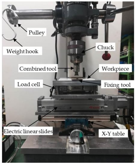 Figure 3 shows an external view of the experimental device. The experimental device was modified by a desktop drilling machine NS-14R (manufactured by Nakane, Tokyo, Japan), where a pulley was connected to the lever part that lowers the chuck, and weight can be attached to the pulley to apply arbitrary load on the workpiece. The combined tool is connected to the main shaft of the drilling machine through a chuck and realizes a rotational movement. In the finishing process, the normal load acting on the workpiece is measured by the load cell under the workpiece table. The horizontal feed movement of the workpiece is provided by an electric linear slides. In addition, the sliding table is fixed on an X–Y table, and the processing area can be adjusted manually.
