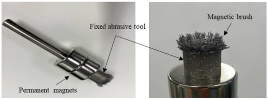 Figure 4 shows the external view of the combined tool. The combined tool is composed of a fixed abrasive tool (cup-type electrodeposition diamond wheel) and two permanent magnets. The grinding surface of the fixed abrasive tool has an outer diameter of 10 mm and an inner diameter of 8 mm. The magnetic field is provided by two ring-shaped permanent magnets with an inner diameter of 6.5 mm, an outer diameter of 19 mm, and a thickness of 10 mm. The magnetic particles are attracted to the bottom surface of the grinding wheel to form a magnetic brush. The combination of magnetic brush and grinding wheel constitutes the grinding tool for this process.