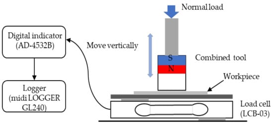 The normal load adjustment system is shown in Figure 5. The combined tool can move in a certain range in the vertical direction. The combined tool is applied with a normal load, which presses the workpiece. There is a load cell (LCB-03, produced by A&D CO., LTD., Tokyo, Japan) under the workpiece, which can measure the load from 0 to 100 N. The load cell is connected to the Digital indicator (AD-4532B, produced by A&D CO., LTD., Tokyo, Japan), and the load value is obtained through the logger (midi LOGGER GL240 produced by Graphtec Corporation, Yokohama, Japan). According to the difference between the load value obtained by the logger and the expected load value, increase, or decrease the normal load applied to the combined tool.