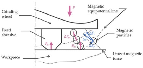Figure 6 shows a schematic diagram of the force analysis of MAF-FAP. The magnetic particles are concentrated and adsorbed in the finishing zone by receiving the magnetic forces ∆Fx and ∆Fy (the resultant force ∆F) expressed by the following equations from the magnetic pole in the direction of the magnetic force line (x-axis direction) and the direction of the equipotential line (y-axis direction) [36].