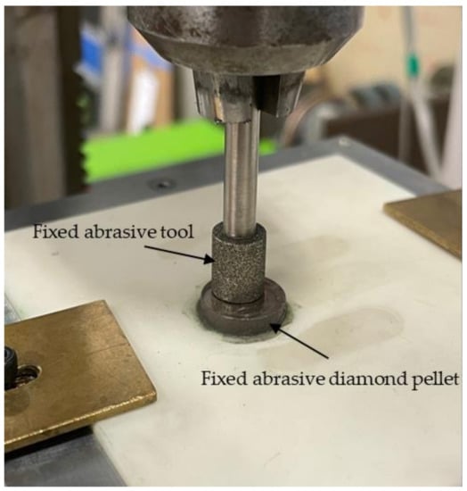 When using a new FAP tool, due to the difference of some factors (such as the height of the fixed abrasive protrusion), this will have an impact on the accurate evaluation of the finishing effect. Therefore, the new FAP tool was pretreated under the same conditions, as shown in Figure 7. The conditions of the pretreatment process are shown in Table 2. The tool used in the pretreatment process is a fixed abrasive diamond pellet. The normal load is set to 4 N, and the rotational speed is set to 1800 rpm. The pretreatment time is 10 min.