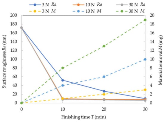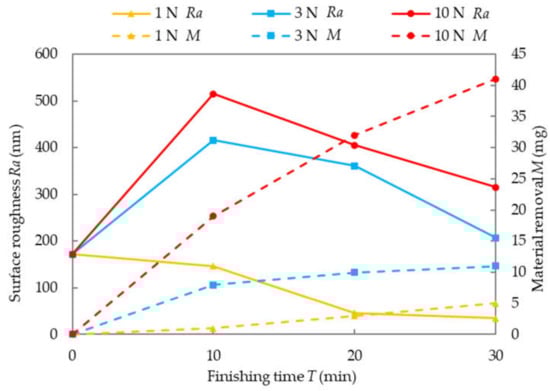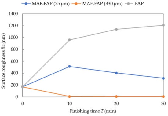 This experiment compares the finishing characteristics of the FAP process and the MAF-FAP process. In the MAF-FAP process, magnetic particles with an average diameter of 75 μm and 330 μm are used respectively. The total normal load is set to 10 N. The change of surface roughness with time is shown in Figure 8, and it can be seen that the surface roughness is improved only when magnetic particles with an average diameter of 330 μm are used. In the case of the FAP process, the surface roughness increases most obviously, followed by the case where the average diameter of the magnetic particles is 75 μm. Figure 9 shows the material removal rate (MRR) in the three cases. Corresponding to the change in surface roughness, the highest MRR in the case of FAP is obtained. In the case of MAF-FAP, MRR is much smaller than FAP, and when the magnetic particle size is 75 μm, the MRR is higher than when the magnetic particle size is 330 μm. In the case of FAP, since there is no magnetic brush to share the normal load, the depth of the fixed abrasive particles entering the workpiece increases, which leads to brittle fracture. Therefore, the amount of material removed is greater and the surface roughness increases. According to the force analysis of the MAF-FAP process, the magnetic attraction force between the magnetic particles increases with the increase of the volume of the magnetic particles (Equation (3)), and at the same time increases with the increase of the magnetic field intensity. Since the magnetic field decreases as the distance from the magnetic pole increases, the ability of the magnetic brush to maintain its shape increases as the volume of the magnetic particles increases and the distance from the magnetic pole decreases. When the average diameter of the magnetic particles is 75 μm, the shape retention capacity of the magnetic brush is lower than 330 μm. This will result in a different distribution of normal loads. In the case where the average diameter of the magnetic particles is 330 μm, Pm increases due to the increase in the magnetic attraction force between the magnetic particles. In turn, the normal load acting on the fixed abrasive particles is reduced, which reduces the depth of the fixed abrasive particles into the workpiece. Although this reduces MRR, it improves surface quality.