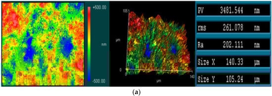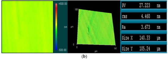 Figure 11 shows the effect of normal load on material removal and surface roughness when the average diameter of magnetic particles is 330 μm. It can be seen from the figure that the amount of material removal increases with the increase of the normal load, and the surface quality is also improved. However, the change rate of surface roughness is the smallest at 3 N, and is almost the same at 10 N and 30 N. Figure 12 shows the measurement results of the optical surface profiler Newview7300 (Zygo Corporation, Middlefield, OH, USA). It can be seen from the figure that the surface quality is greatly improved after finishing. According to the measurement results, when the average diameter of the magnetic particles is 330 μm and the normal load is 30 N, the surface roughness of the workpiece is improved from 202.11 nm to 3.67 nm within 30 min.