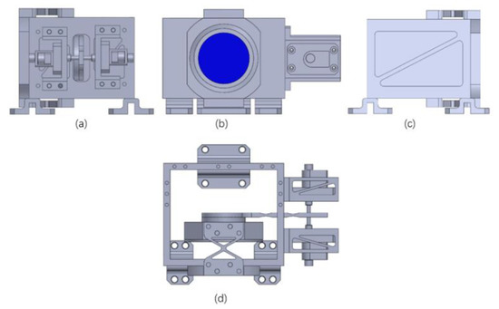 3D model of the assembly of the swing micro-mirror structure: (a) right view; (b) main view; (c) left view; (d) upper view.