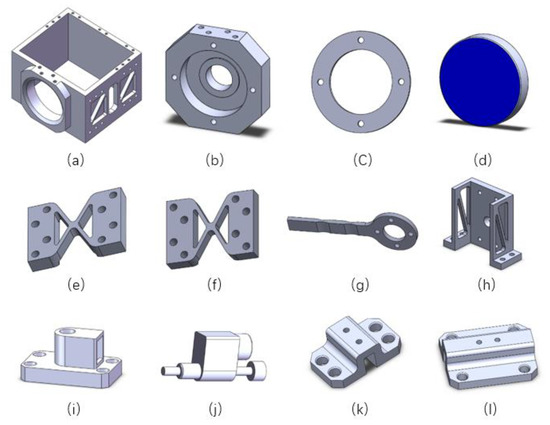 3D model of the parts of the swing micro-mirror structure: (a) framework; (b) mirror cell; (c) mirror fixed plate; (d) mirror; (e) flexible hinge A; (f) flexible hinge B; (g) flexible arm; (h) actuator connecting plate; (i) actuator keep plate; (j) actuator; (k) supporting foot A; (l) supporting foot B.