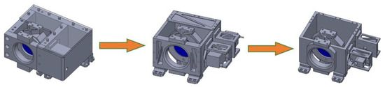 In order to reduce the launch cost, the weight of the swing micro-mirror structure must be reduced as much as possible under the premise of meeting all the requirements [14]. There are several ways to reduce the total weight of the mechanism: (1) reduce unnecessary parts or reduce the size of parts; (2) hollow out the components to remove the weight of part of the volume; (3) choose lighter materials. Figure 3 presents the initial model and the final model of the mechanism.