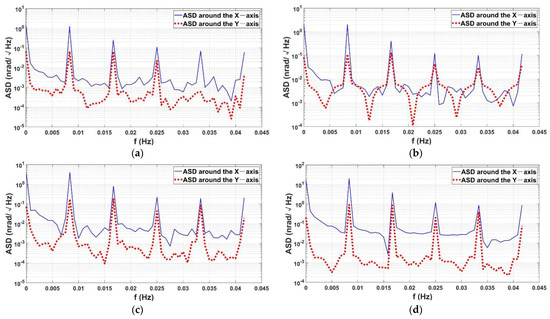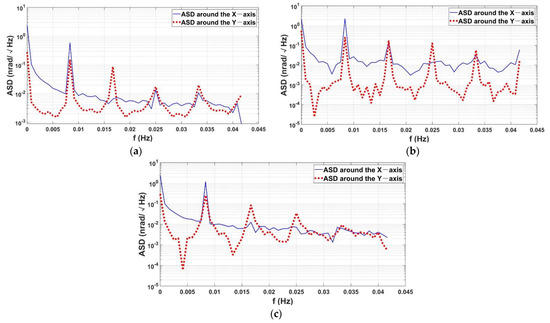 Figure 7 shows that the maximum amplitude spectral density around the X-axis is about 2.5 nrad/√Hz, and the maximum amplitude spectral density around the Y-axis is less than 0.6 nrad/√Hz under the three heating conditions. The value of the maximum amplitude spectral density around the X-axis is still greater than that around the Y-axis, which indicates that the thermal stability of the mechanism around the X-axis is not as good as that around the Y-axis. This is mainly due to the design of the mechanical structure of the mechanism.