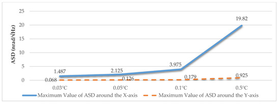 It can be seen from the data in Figure 6 that the maximum amplitude spectral density around the X-axis of the mechanism is greater than that around the Y-axis, with a difference of more than 10 times. Therefore, the value of the maximum amplitude spectral density around the X-axis can be regarded as the value of the total amplitude spectral density. By comparing results under four temperature variation ranges, it can be found that the value of the maximum amplitude spectral density increases with the increase of temperature range. The increase multiple is basically consistent with the increase of temperature range. According to the result of the simulation, when the temperature variation range is controlled within 0.1 °C, the amplitude spectral density of the mechanism is less than 5 nrad/√Hz, which can meet the requirement of design.