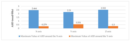 Finite element thermal analysis of the swing micro-mirror structure is carried out according to the four temperature variation functions in Table 5. The mirror angle deviation at each moment is converted into the amplitude spectral density (ASD) function. The corresponding curve is presented in Figure 5. Detailed data are shown in Figure 6. The outward direction perpendicular to the main view in Figure 1 is the positive direction of the Z-axis, the vertically downward direction is the positive direction of the Y-axis in the main view, and the left direction is the positive direction of the X-axis in the main view.