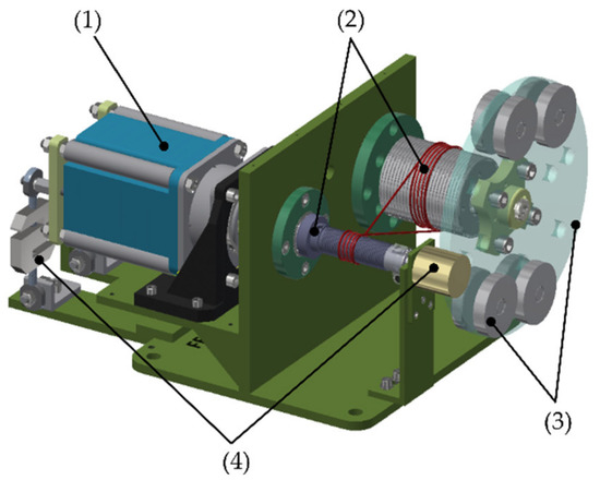 The transmission module is configured by a cable or rope and two systems: (a) a pulley system, which is coupled to the link module, and (b) a motor shaft system, which is coupled with the motor or power source. The proposed transmission has some differences from those in the test benches used by Xie and Lu [16,28]. The most important differences are: (a) Our transmission is multi-turn, (b) the cable in our transmission can have multi wraps on the pulley and motor shaft and (c) in our transmission, the pulley, and the motor shaft can be easily changed.