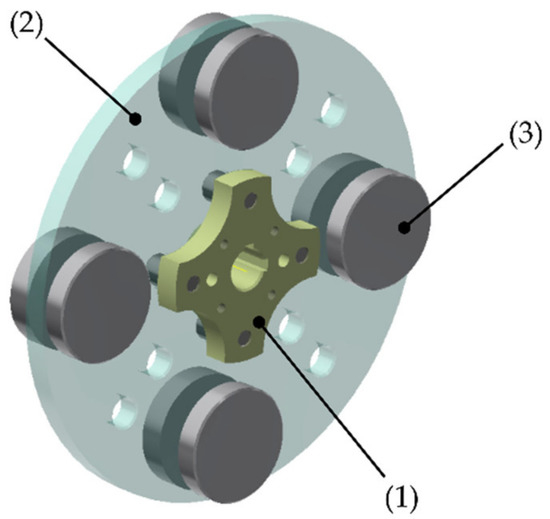 CAD model of the link module: (1) link coupling plate; (2) disk; (3) additional masses.